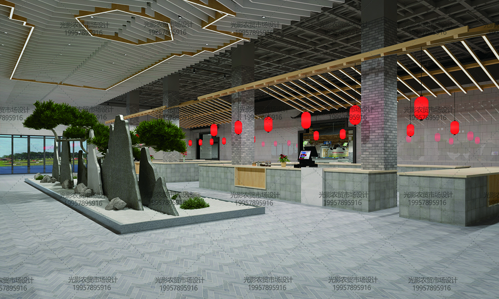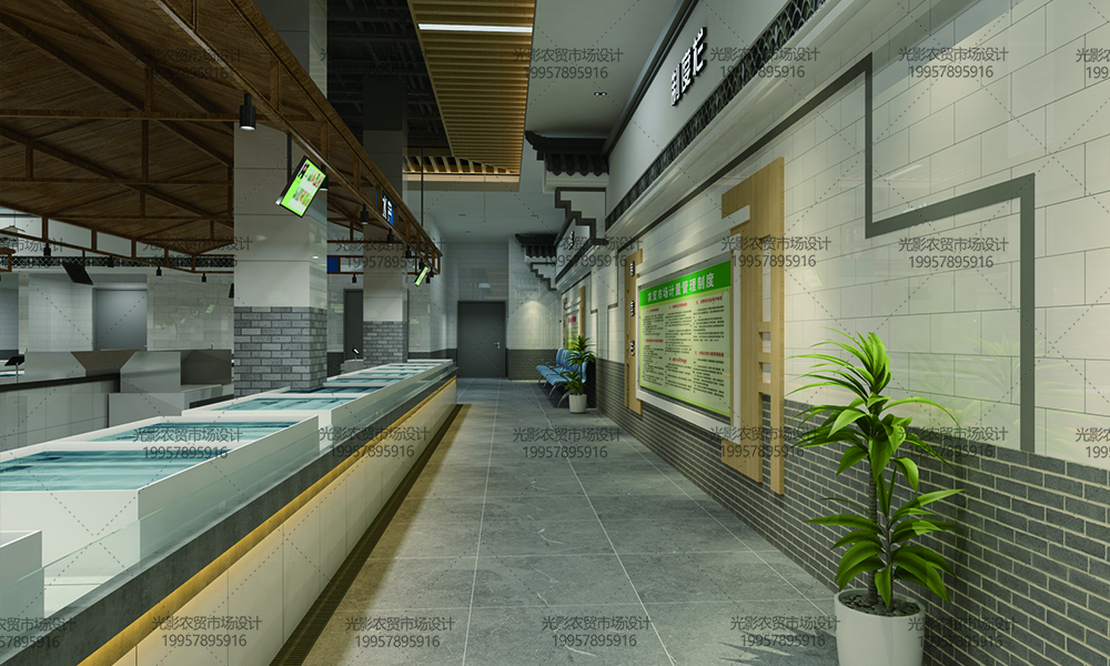 2.相较于传统农贸摊位混乱导致的脏乱差,本市场采用宽敞型岛台的更加便于商品的陈列。岛台黑白相间,人工照明的合理利用更好的呈现出食材质感,调动顾客的购买欲。